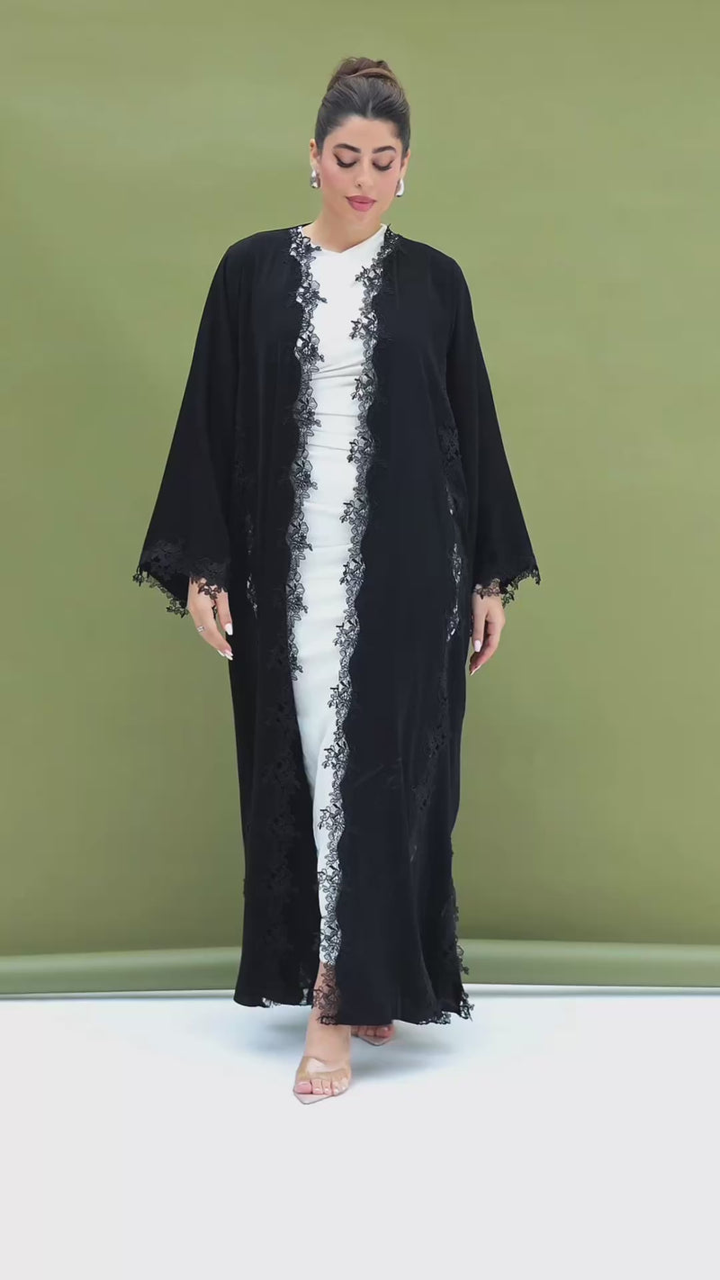 A refined abaya crafted from premium Korean Nada fabric, designed in a straight-cut (سيدا) silhouette that offers a clean, elegant, and timeless look. The front opening and sleeves are adorned with rich, intricate lace embroidery, adding depth, femininity, and a luxurious finish to the classic black tone.